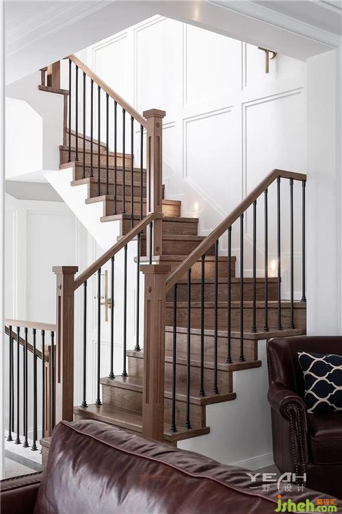 櫻桃木色的樓梯用防滑地板鋪設(shè),室內(nèi)設(shè)計(jì)師為家里的四位長輩帶來貼心的使用感;色系搭配與客廳呼應(yīng),和諧自然。