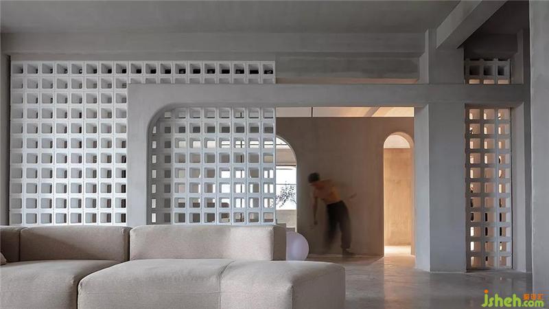 整個(gè)600平的空間分割成大回字形,兩邊的過(guò)道光線比較弱,便采用了空心磚作為半隔斷形式,將光線偷進(jìn)來(lái)的同時(shí),還要為它塑形。解決暗部問(wèn)題也增加了空間體驗(yàn)感。