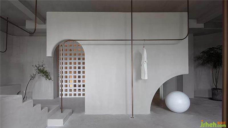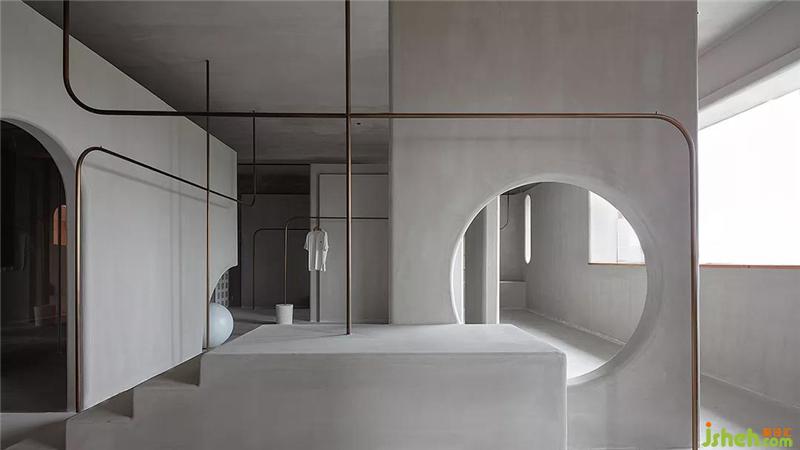 An empty shell creates countless partitions for it as a clothing display. This is too rigid. Break them with straight lines or arcs, and then regroup. No matter where you stand, you can look at it with a different sense of space. , And the shape of these lines cut the light into different shapes.