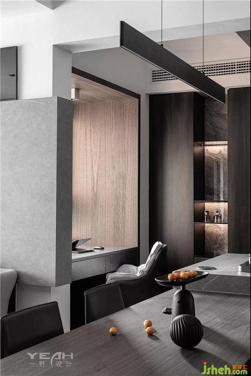 深色幾乎覆蓋了整個(gè)空間和家具,通過不同材質(zhì)的運(yùn)用、構(gòu)造形式與尺寸建立了整體視覺層次變化比較豐富的現(xiàn)代空間。