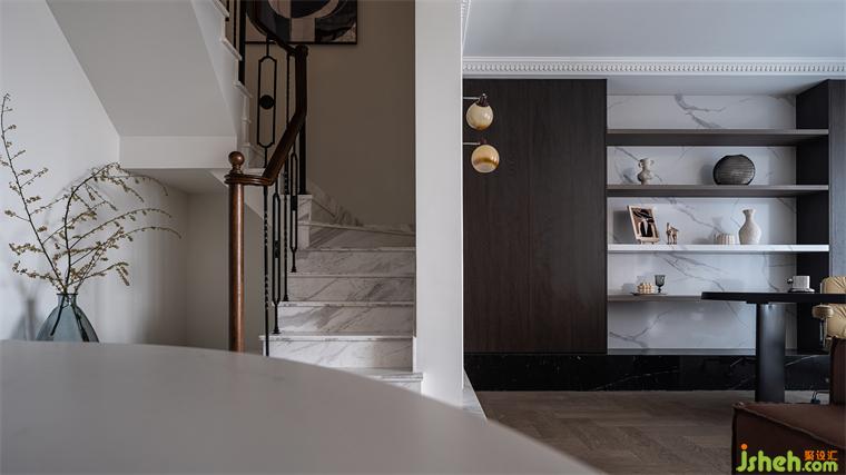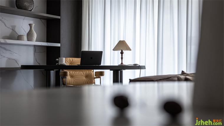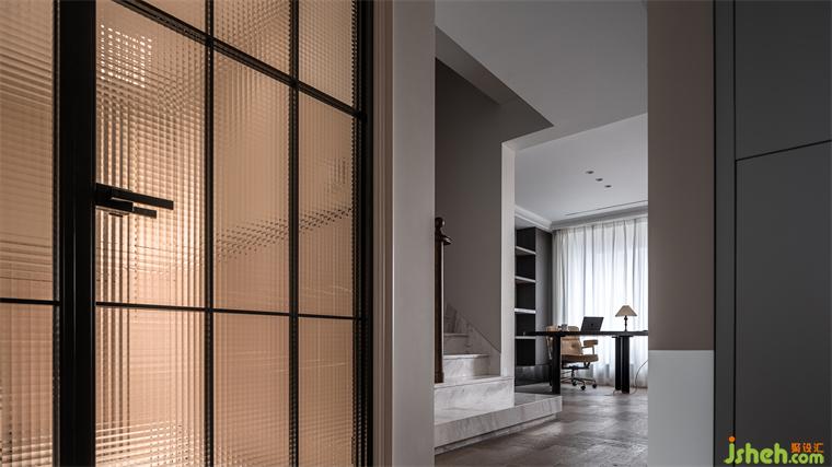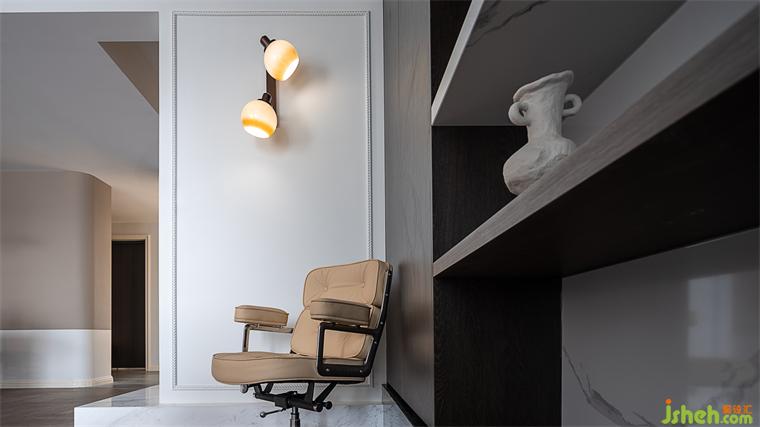 開放式的書房視野明朗,心胸也隨之開闊。書架依墻,簡潔的構造與墻面形成豐富的層次,蘇州國瑞熙墅豪宅設計展示書房的淡泊與豐滿。
