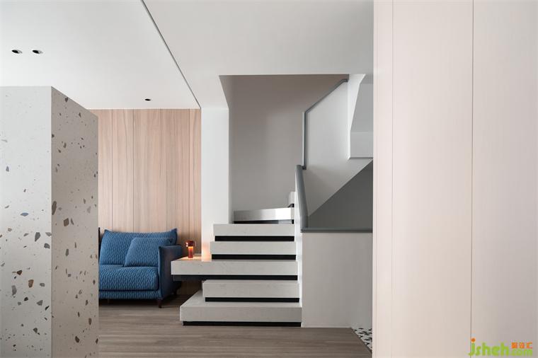 寶藍(lán)的色調(diào)沉靜優(yōu)雅,用色彩賦予空間活力。沙發(fā)的邊幾別具巧思,由臺(tái)階延伸而來,充滿想象力的設(shè)計(jì)不僅實(shí)用,蘇州別墅裝飾還富有讓人會(huì)心一笑的趣味性。