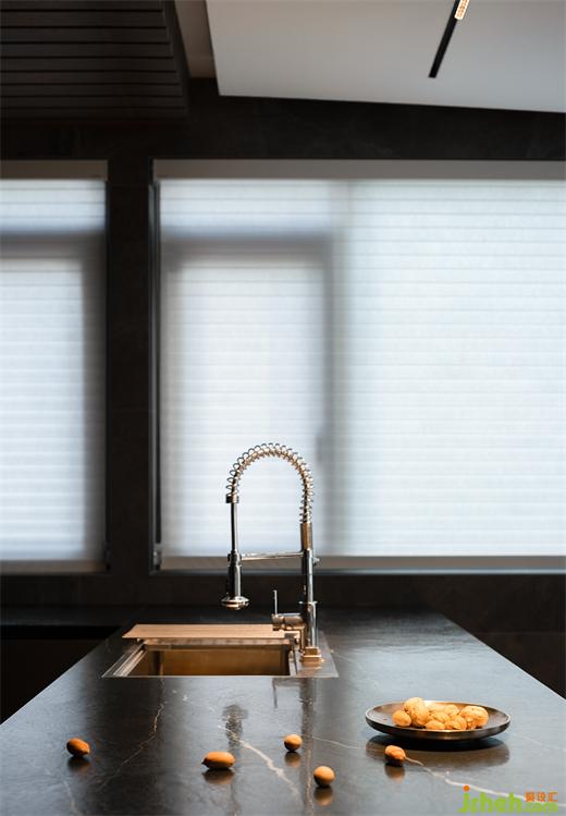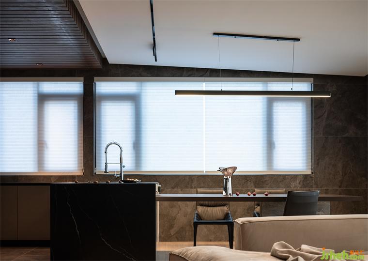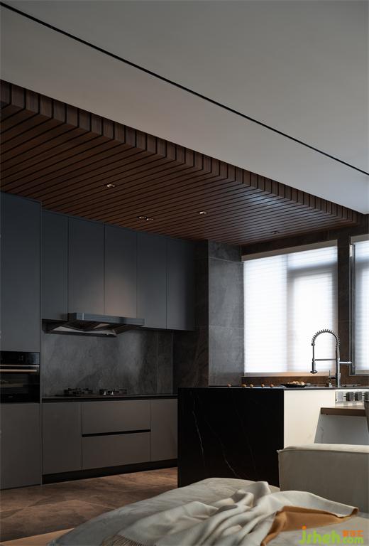 開放的公共空間讓一家人的聯(lián)系更緊密,依據(jù)功能屬性則設(shè)計(jì)有所區(qū)別。木飾面吊頂在空間畫出一道涇渭分明的線,貴陽豪宅設(shè)計(jì)將烹飪區(qū)與用餐區(qū)分隔開來。深色調(diào)與石材結(jié)合,彰顯質(zhì)感的同時(shí),蘊(yùn)藏日常生活的智慧,讓清潔工作更簡單便捷。
