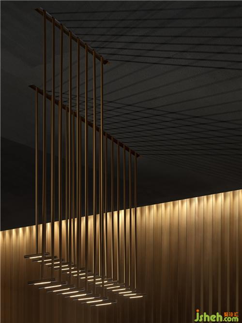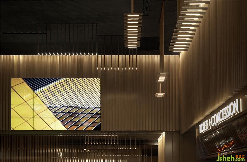 大堂中也以此方式來(lái)設(shè)計(jì)不同功能區(qū)之間的隔斷,分開(kāi)大堂和入場(chǎng)通道。層層疊疊錯(cuò)落的格柵效果,產(chǎn)生另外一種特殊的光影視覺(jué)。我們也將“琴弦”的概念延續(xù)設(shè)計(jì)出了一款定制的燈具,一根根從天花上吊裝下來(lái)的燈具,通過(guò)不同的長(zhǎng)度和平行的排列方式。這種好似琴弦線一樣燈具,讓觀者時(shí)刻感受到這一設(shè)計(jì)的主題概念。電影院設(shè)計(jì)