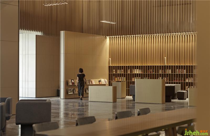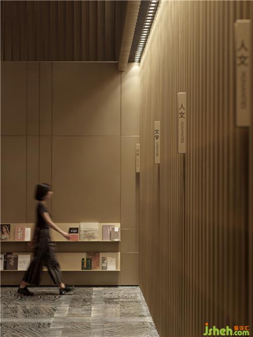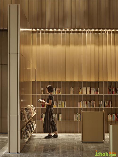 地面石材的拼接,兩種不同質(zhì)地和顏色的石材,在大堂中排列開(kāi)來(lái),平行縱橫拼接,且與天花上的造型燈相呼應(yīng)。書架以及隔斷之間所形成的呼應(yīng)關(guān)系,讓金色的金屬質(zhì)感在空間中更加明顯。大堂中的賣品區(qū)和書吧分別在大堂的兩端,相互融合卻互不打擾,讓兩邊的顧客能夠各取所需,享受屬于自己的閑暇時(shí)光。