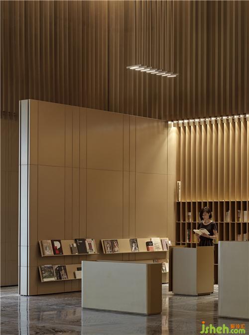 每一根琴弦平行排列,從低音到高音,根根琴弦清晰可見(jiàn),供樂(lè)手演奏,設(shè)計(jì)師將“琴弦”特點(diǎn)融入到空間設(shè)計(jì)之中。于是,設(shè)計(jì)師將影院的大堂四周設(shè)計(jì)成一列列豎向的格柵,并且從天花一直延伸到地面。整個(gè)項(xiàng)目從最開(kāi)始的功能設(shè)計(jì)階段,就考慮融入一個(gè)小型的書店,設(shè)計(jì)師腦中浮現(xiàn)文人雅士撫琴讀書的場(chǎng)景,于是我們也將琴弦的概念統(tǒng)一的表現(xiàn)在書店的部分,來(lái)增強(qiáng)這兩種文化元素的組合;統(tǒng)一的設(shè)計(jì)手法延伸到書店,圖書區(qū)書架與整體造型一致,延伸下來(lái)的造型,其中三層被用作書架使用;琴弦和圖書的組合,讓人們?cè)谛菹^(qū)別外增添了一份禪意,我們也并沒(méi)有用過(guò)多和過(guò)于復(fù)雜的顏色,用燈光的效果來(lái)增強(qiáng)空間之中的光影變化,以此來(lái)強(qiáng)調(diào)其文化的屬性和特點(diǎn)。電影院設(shè)計(jì)