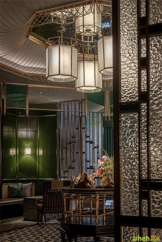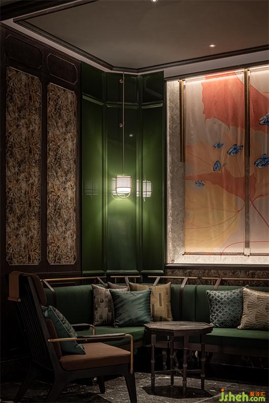蝴蝶刺繡畫的卷軸裝置,蝴蝶標本的畫框,好像隨時都有蝴蝶飛出翩翩飛起舞;展開的折扇,吊掛的毛筆,仿佛時刻有文人墨客緩緩走來;顏色跳脫的花藝,為暗沉的空間增添一分亮色;鏡面裝置增加互動的同時,也起到延伸視覺的效果。