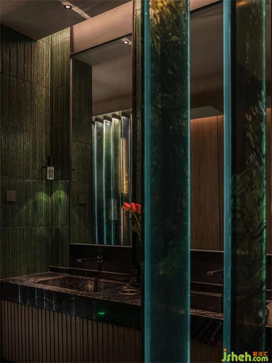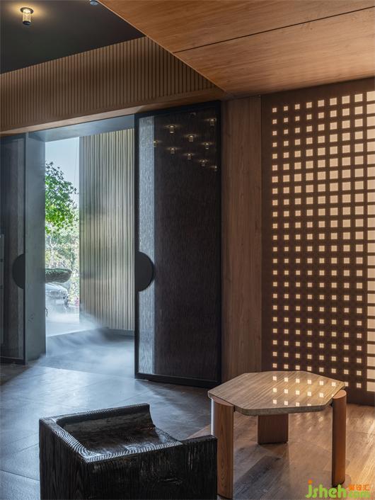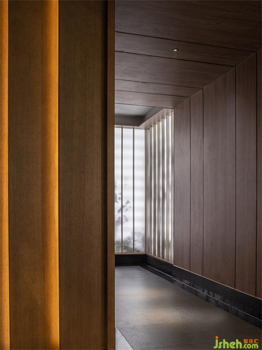 及至過道,豎向的格柵將墻面的光感推遠(yuǎn),養(yǎng)生店設(shè)計(jì)形成意境上的虛寫,加強(qiáng)走過時(shí)視線上的秩序與變化,給人以聯(lián)想的空間;
