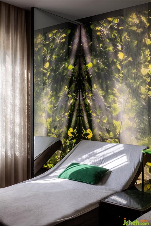 最終到達(dá)包廂之時(shí),撥開枝丫,重見暖陽(yáng)。萌發(fā)的枝葉也在這里逐漸繁茂為一片片的綠蔭,墻面的鏡子將這一片暖陽(yáng)無(wú)限延伸,也是意味著生命力的無(wú)限可能。