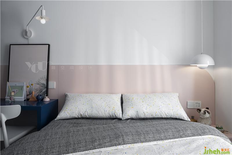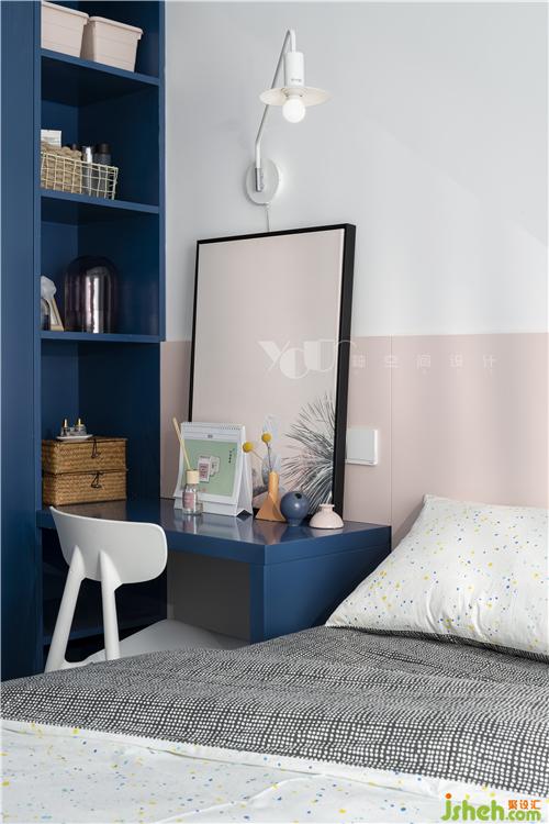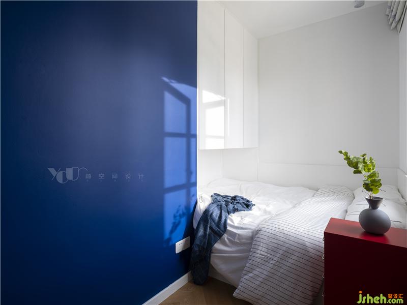 柜子、床頭延續(xù)了外廳的紅藍(lán)配色,但比例不大,整體的軟飾還是以素雅為主,更多的考慮了主臥室的睡眠功能,擔(dān)心大面色塊影響到入眠情緒。