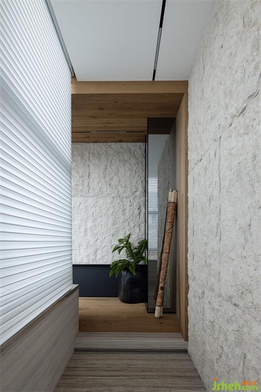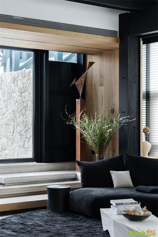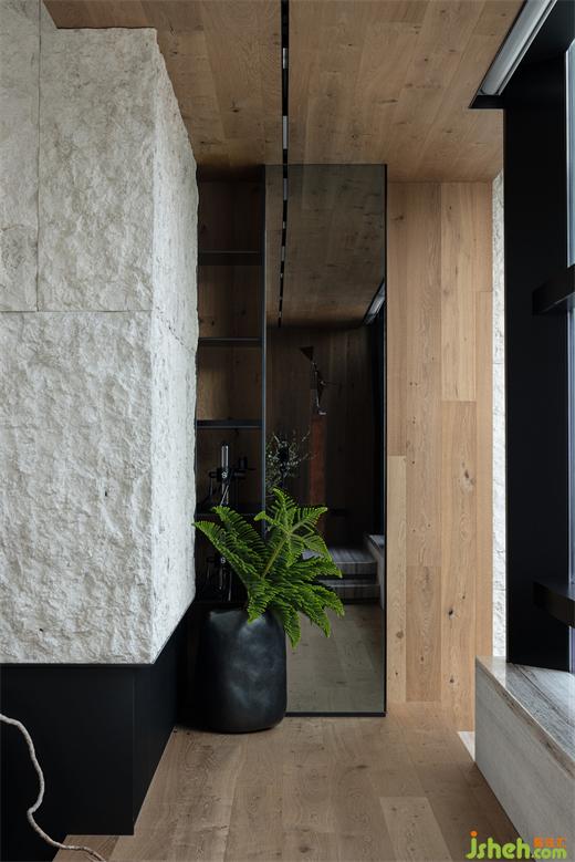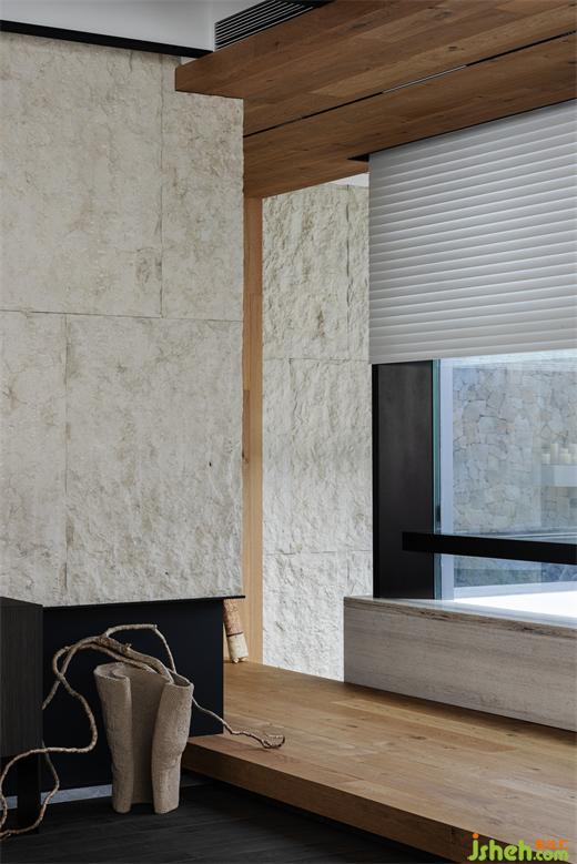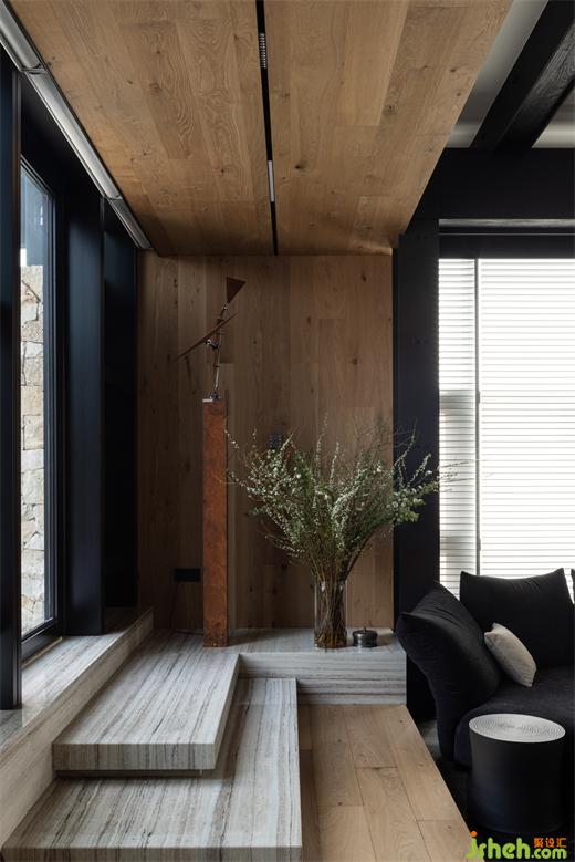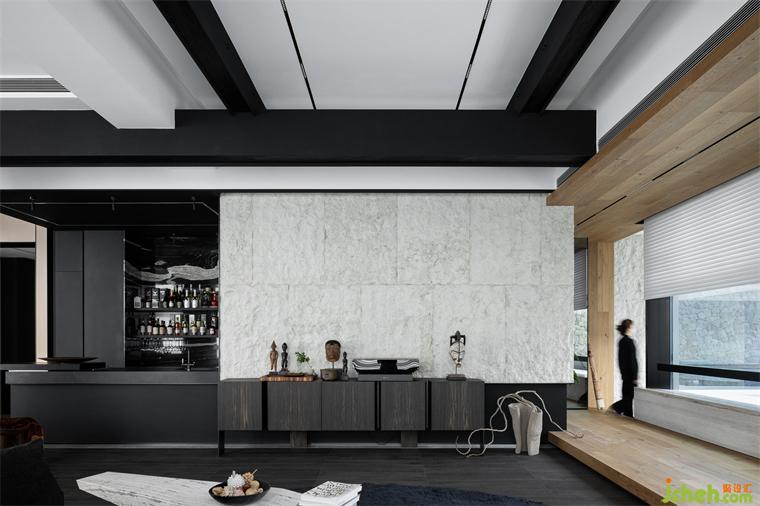 鋼梁和老榆木在天花形成縱橫的組合結(jié)構(gòu),為空間創(chuàng)造了一種近乎雕塑的質(zhì)感,喚起了一種既原始又精致的風(fēng)情;結(jié)合電視墻石材自然的表面紋理和凹凸不平的粗獷質(zhì)感,深圳別墅裝修設(shè)計(jì)與Medoc梯形橫鋸紋的木地板,展現(xiàn)了自然與現(xiàn)代的結(jié)合,亦是一種對于現(xiàn)代建筑美學(xué)的回溯和反思。