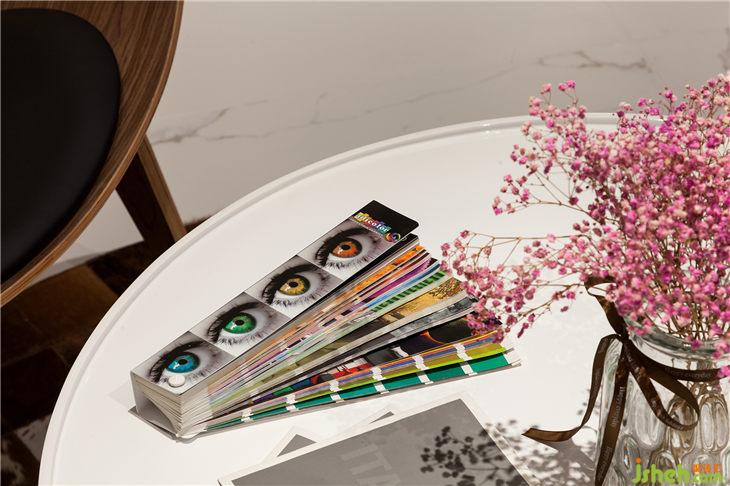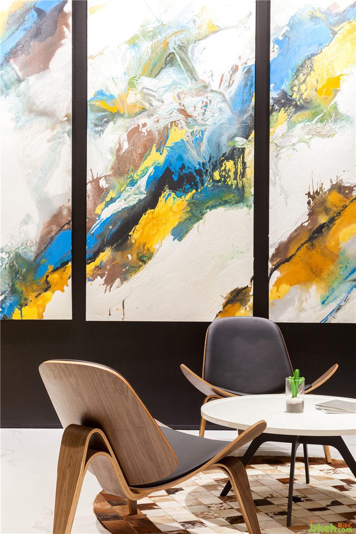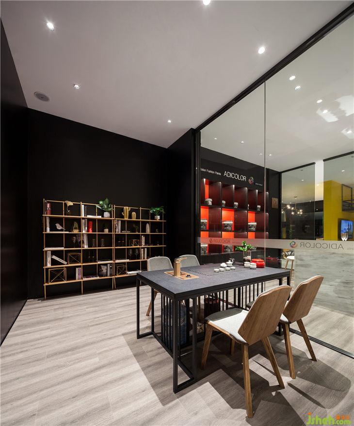 另一處洽談區(qū)設(shè)置在小吧臺(tái)旁邊,仿家庭客廳的裝飾讓客戶更直觀的了解到單色涂料在日常生活的應(yīng)用效果。