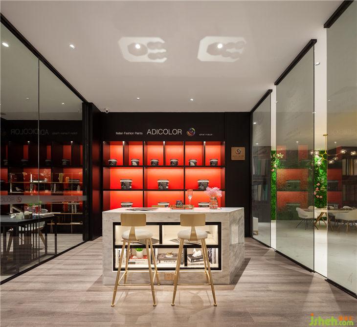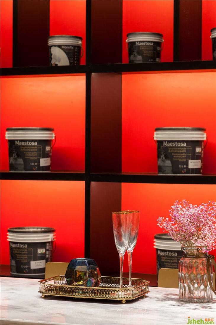 小吧臺(tái)區(qū)更顯精致,儲(chǔ)物展示柜的黑與愛馬仕紅形成鮮明對(duì)比,呈現(xiàn)出強(qiáng)烈的視覺沖擊感,突出單色涂料產(chǎn)品的“藝術(shù)”這一特點(diǎn)。