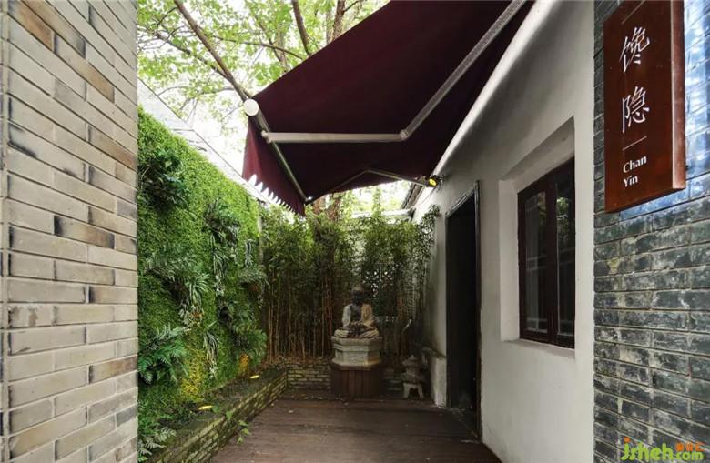 走過與世不同的前院,才能尋找到世間隱匿的寶地。進(jìn)門處,設(shè)計(jì)師由偉壯,以一尊佛像、青磚、水泥墻、竹枝、綠葉為設(shè)計(jì)要素,將進(jìn)門處藏于古樸與簡潔之中,同時(shí)用木質(zhì)招牌、門窗將所來之客的世事紛擾拒于門外。