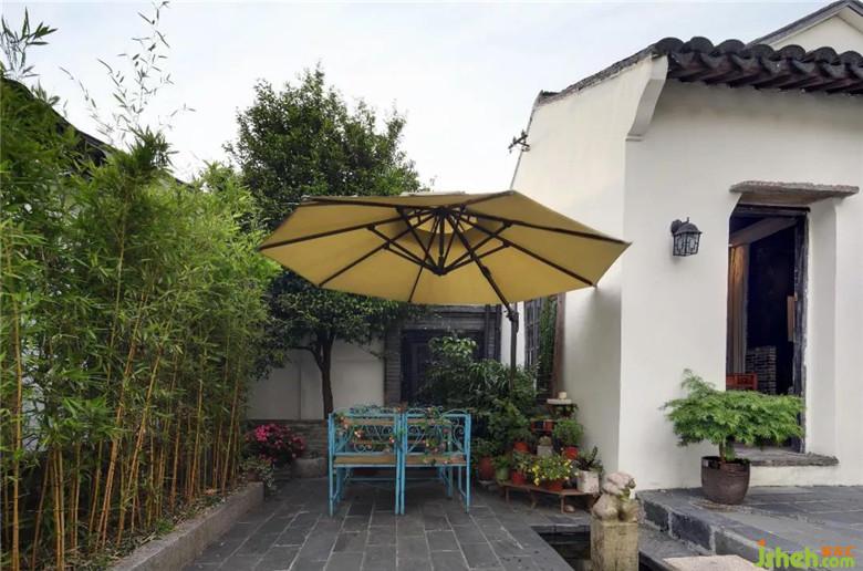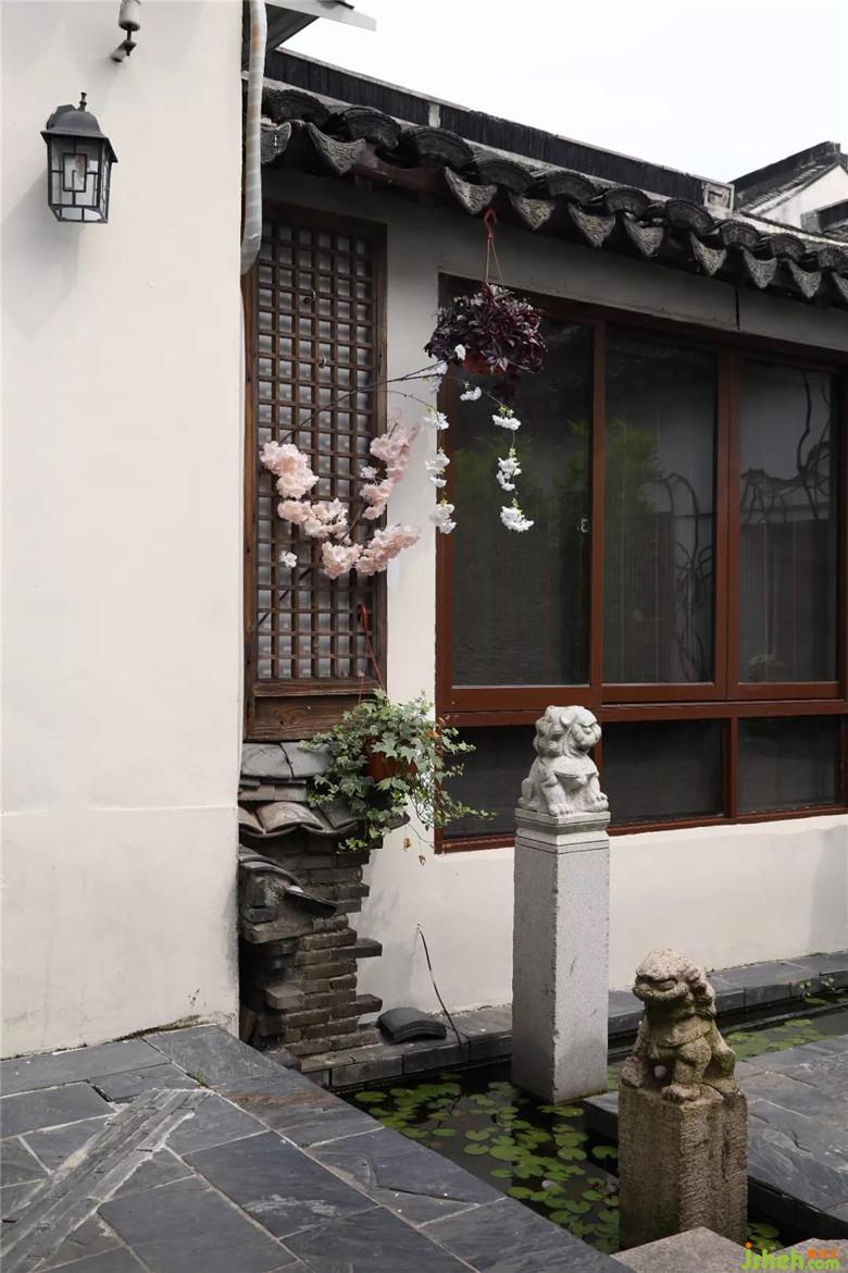 在庭院中,可以看到以藍(lán)色桌椅、遮陽傘為點(diǎn)綴,為進(jìn)入此門的人帶來一種假期中的休閑。且設(shè)計(jì)師別出心裁地使用水與浮葉作為分隔工具,以石階作為連通兩者之間的工具,在石階兩旁各擺一只小石獅。當(dāng)有來客穿行之間,可再為其洗濯身上所攜煩惱。