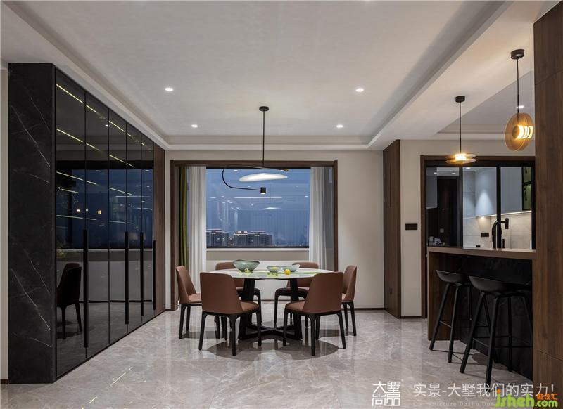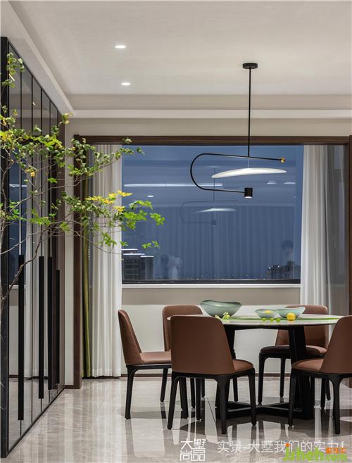 棕色皮質(zhì)餐椅、不規(guī)則吊燈及柔和的燈光,打造出了一個優(yōu)雅情趣、充滿儀式感的用餐環(huán)境。