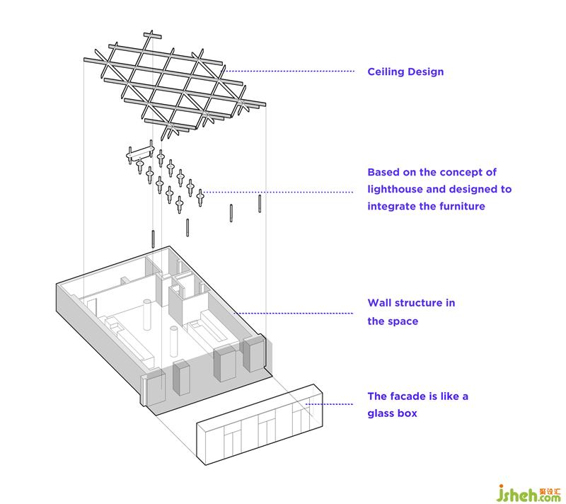 燈柱隨著時(shí)間緩慢的變暗又逐漸亮起,以此重現(xiàn)燈塔的閃爍周期。人們可以透過(guò)入口前廳的玻璃盒子,看到店內(nèi)的燈柱緩慢的明暗交替,結(jié)合自然光線(xiàn)的變化,空間由早至晚呈現(xiàn)著不同的迷人表情。店鋪裝修