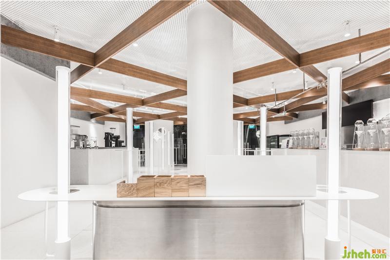 The light belts hidden wooden frame in the ceiling produce the diffused reflection to create the soft illumination and atmosphere for the interior, with the spotlights as a visual partition to divide the seating areas and passages.