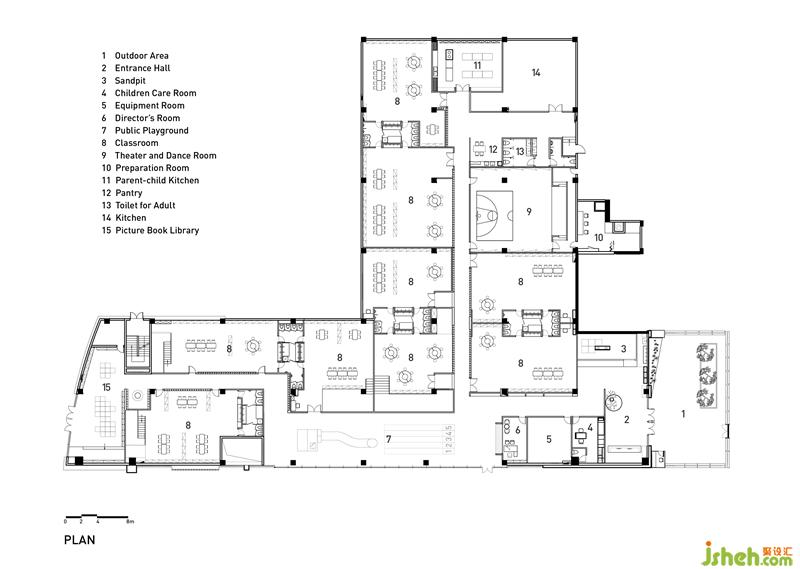 前廳是是每個(gè)孩子每天在進(jìn)入這幢建筑之后的必經(jīng)之路,我們希望除了接待功能之外,前廳也是一個(gè)有趣的、有活力的的空間,因此沙池被安排到該區(qū)域靠窗的位置,讓孩子可以陽(yáng)光中活動(dòng)。裝修公司