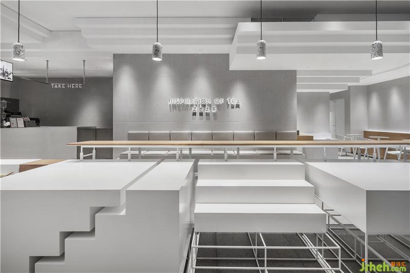 設(shè)計構(gòu)想來源于《紀念碑谷》中縱橫交錯的空間形態(tài),以打散重組在空間中的臺階做為概念的表現(xiàn)形式,錯落有致的體塊結(jié)合臺階形態(tài),自上而下延伸至整個空間。在材質(zhì)及造型上,為緩解小空間固有的壓迫感,使用白色基調(diào)和方正的體塊拓展空間界面。奶茶店設(shè)計