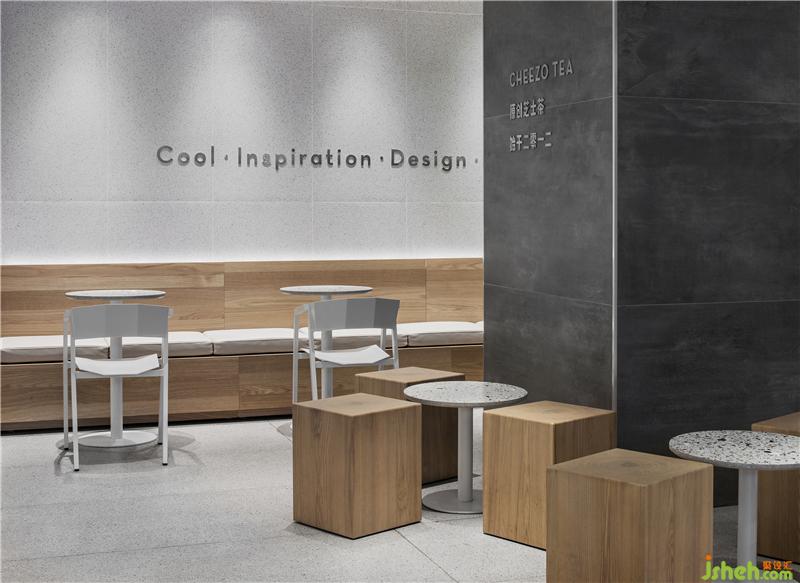 從室外看向室內(nèi),虛實交錯的體塊造型鋪滿空間,中島組合成陣列分布,形成了張弛有度的友好姿態(tài)。奶茶店設(shè)計