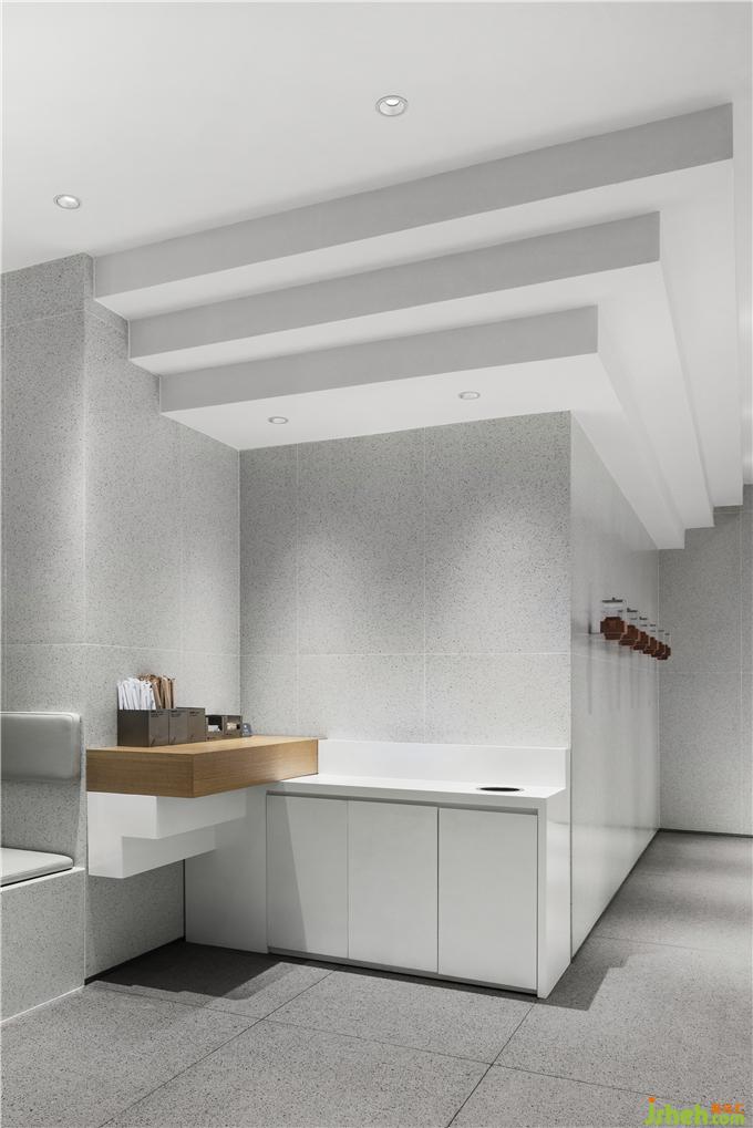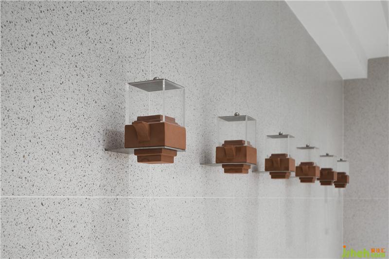 ▼ 茶具以傳統(tǒng)的陶土為器身,壺蓋則以透明亞克力制成,底部臺(tái)階狀的形式便于固定于墻面。奶茶店設(shè)計(jì)