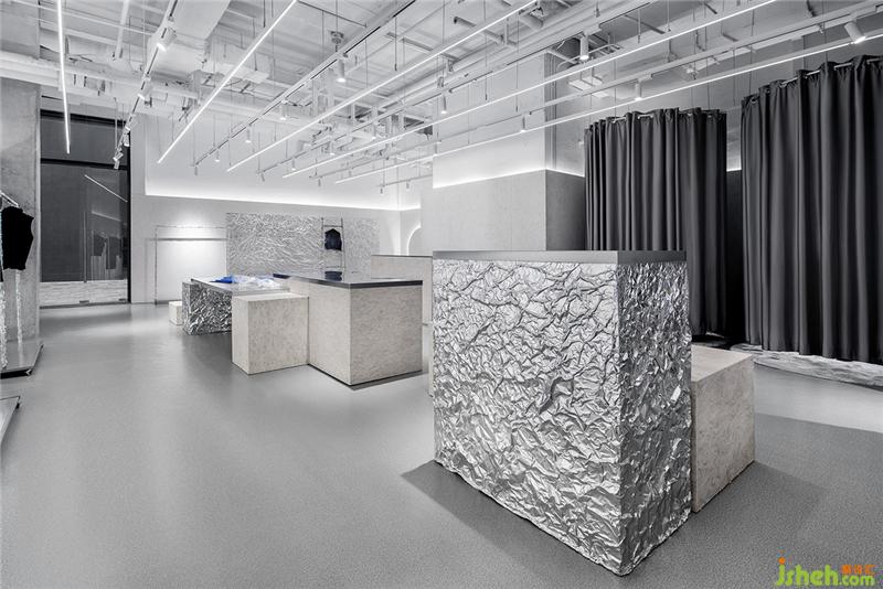 空間中沒有固定的陳列架,取而代之的是showroom里最常見的金屬陳列架,架子上包裹的錫紙低調(diào)的傳達出品牌的核心工藝。