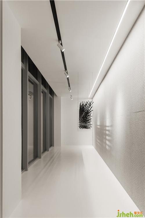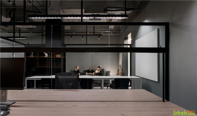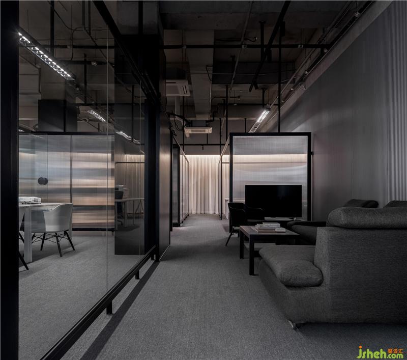 通過(guò)前廳進(jìn)入室內(nèi)辦公區(qū),空間的基調(diào)由亮轉(zhuǎn)暗,自然的完成了空間氛圍與情緒的轉(zhuǎn)換。