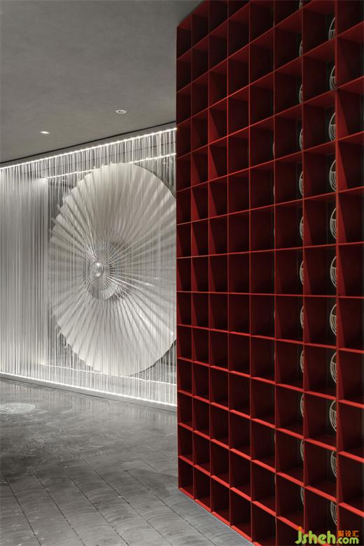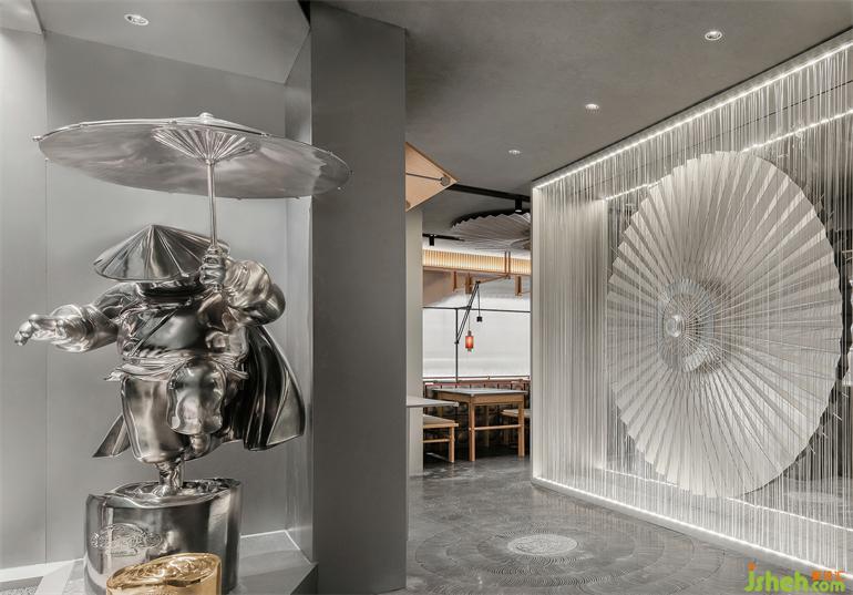 The rain scene at the entrance of the restaurant is designed with real rain and linear lighting. Interspersed with translucent glass tiles, it forms a painting in the rain, putting on the show of “Wulin in the Rain” right at the entrance.