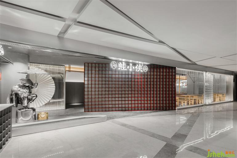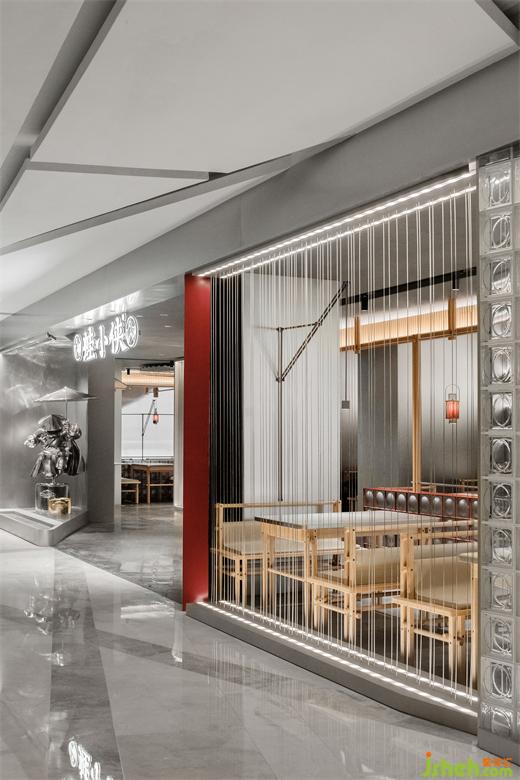 南寧餐廳設(shè)計店鋪入口展面分布雨景意境區(qū),以真實的落雨場景結(jié)合線性燈光,中間穿插半透明的玻璃磚造型,構(gòu)成一幅雨中的畫卷,將“雨中的武林世界”在入口處就直白地展現(xiàn)出來。