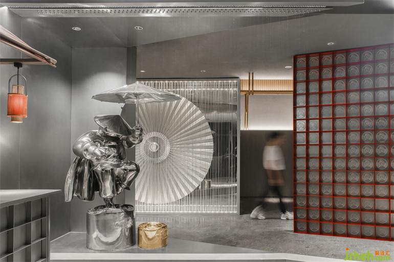 蛙小俠的IP形象也進(jìn)行了一次深度定制,整體鍍鉻鏡面的效果更具現(xiàn)代感,手中撐傘并輕盈落于水面的姿態(tài),南寧餐廳設(shè)計(jì)更加深了雨景和俠客之間的關(guān)聯(lián)印象。