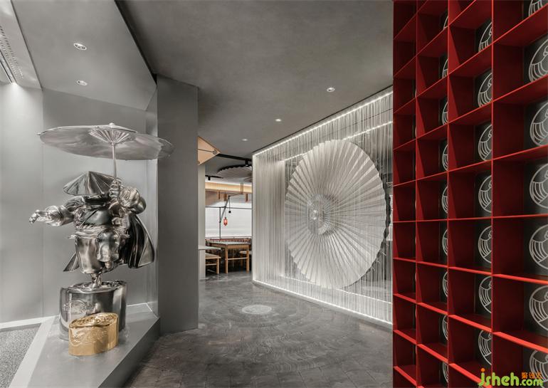 There are several dynamic umbrella installations in the restaurant, which suits the theme of “Wulin in the Rain”. The umbrellas are objects used by ordinary people when it rains. As for the protectors like “Kungfu Hero”, they don’t always carry the umbrella. They are no different from ordinary people. But when they need to protect others, the umbrella at their fingertips can be transformed into a weapon. Moreover, the “umbrella” itself has the function that deepens the meaning of “protection”.