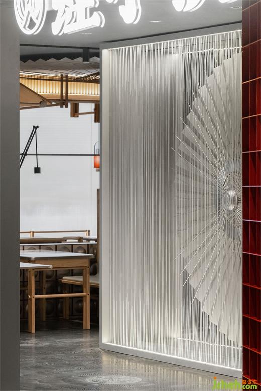 在入口處設(shè)置的動(dòng)態(tài)雨傘裝置,通過傘面裝置和傘架裝置雙層反向旋轉(zhuǎn)的形式,南寧餐廳設(shè)計(jì)形成空間的視覺焦點(diǎn),同時(shí)在入口處也隱約可見該裝置,給人以探究的欲望。