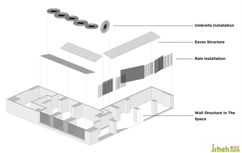 入口處可看到旋轉(zhuǎn)的雨傘裝置,前方通過鋼絲和燈光形成“雨絲”
