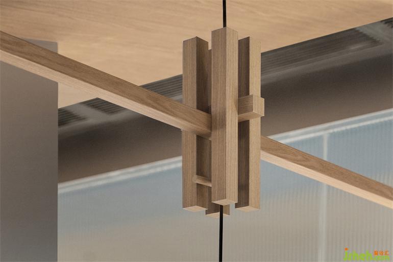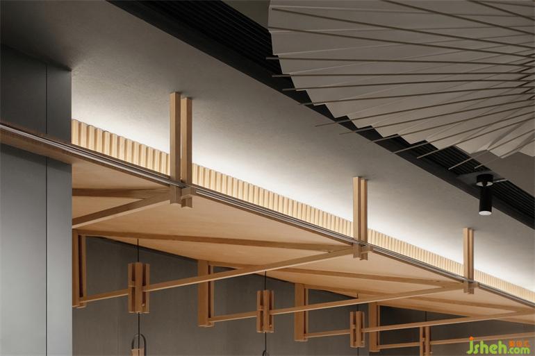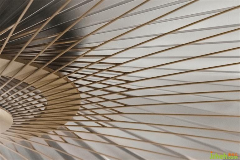 傘的元素不止體現(xiàn)在動態(tài)裝置上,在解構(gòu)了雨傘后,傘架結(jié)構(gòu)也延展至空間內(nèi)部的屋檐結(jié)構(gòu)和道具細節(jié)上。