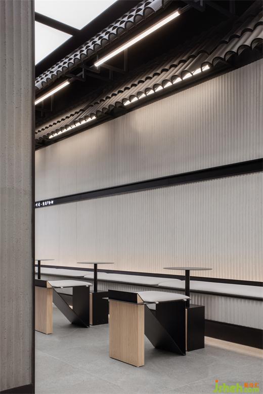 細(xì)密的金屬?zèng)_孔板形成半通透的效果,幾層疊加構(gòu)成江南水鄉(xiāng)的屋檐形態(tài),蘇州餐廳設(shè)計(jì)結(jié)合空間布局勾勒出建筑與院落的關(guān)系。立面則使用白色的水泥軟陶墻板,以其樸質(zhì)的肌理質(zhì)感回應(yīng)傳統(tǒng)建筑立面的屋檐和雕花木窗。