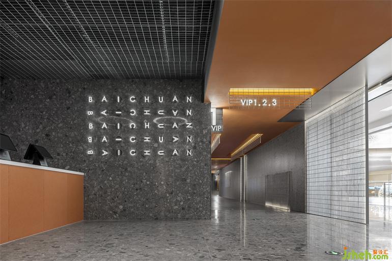 觀影通道作為顧客從大廳進(jìn)入影廳的過渡空間,是一個(gè)使顧客強(qiáng)化印象的重要空間,亮橙色天花體塊,從大廳向觀影通道延伸。