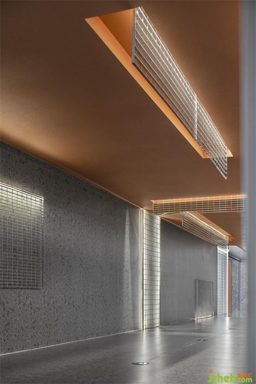 大廳的橙色天花體塊向通道延伸