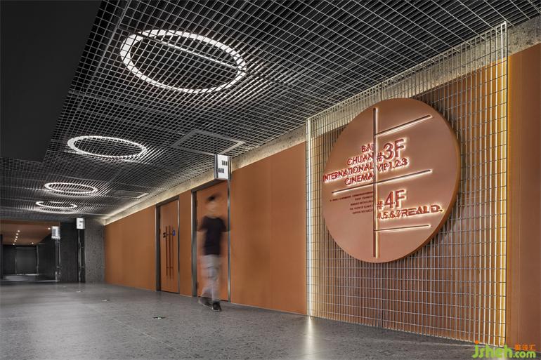 影院跨越兩層,上方一層不設(shè)大堂,MOC沿用了設(shè)計(jì)元素,影城設(shè)計(jì)將亮橙色運(yùn)用于立面,天花則保留了一層大廳的環(huán)形燈與隔柵的做法,使整個(gè)空間在統(tǒng)一的調(diào)性中又富有變化。