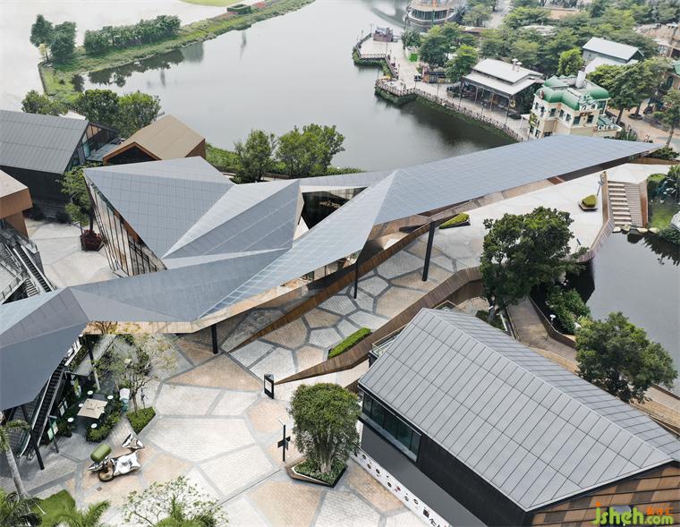 體驗中心設(shè)計從室內(nèi)向外生長的棱鏡造型,與建筑外部的雕塑達成銜接