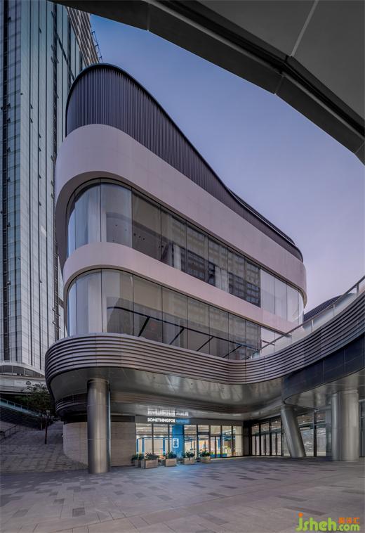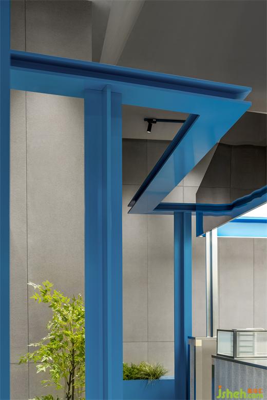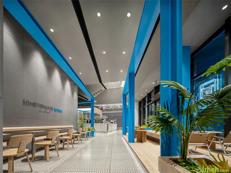 “設(shè)計(jì)師期望把休閑庭院的感受再次帶給用戶,提取傳統(tǒng)元素中的“廊”、“柱”、“亭”等元素,又將其做了現(xiàn)代化的重構(gòu),借空間的縱向尺度凸顯結(jié)構(gòu)張力,并融合藍(lán)色曲廊和鏡亭,構(gòu)筑具有現(xiàn)代審美趣味的都市休閑庭院。