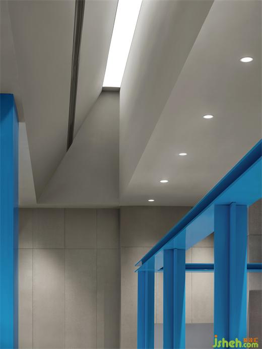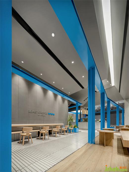 咖啡廳設(shè)計師利用空間的縱向尺度,通過跌級高差形成采光天井,內(nèi)置的燈膜灑下的均勻光線渲染了空間的自然氛圍。