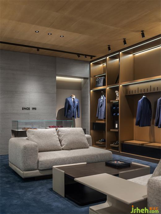 專賣店設(shè)計(jì)高定區(qū)通過深藍(lán)色的地毯沉淀出沉穩(wěn)的調(diào)性,經(jīng)典的家具與木質(zhì)的天花共同構(gòu)建出高雅的氛圍。
