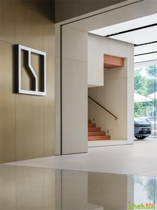 通透的玻璃幕墻引入自然光,米色的石材結(jié)合均勻的照明,為展車打造了溫暖明亮的環(huán)境。橙色的石材點綴其中增加空間活力。