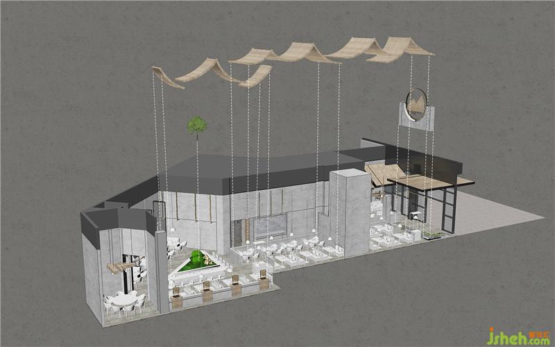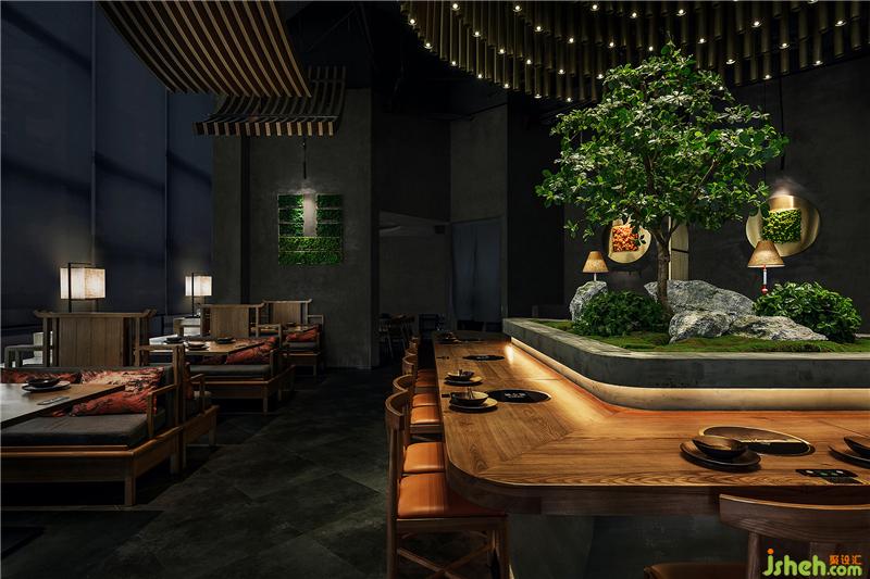 心靈的歸屬感幻化為具象的屋頂,因?yàn)椤绊敗笔窃O(shè)計(jì)者心中空間的界定。門口的屋頂元素成為室內(nèi)外空間的分割,同樣的造型元素延伸至室內(nèi)逐漸深入的歸屬感在設(shè)計(jì)者的心中蕩漾,我們開始添加一點(diǎn)潤(rùn)物之水,再由水的畫面感帶來遠(yuǎn)山在側(cè)清風(fēng)入懷的遐想。以設(shè)計(jì)的語(yǔ)言進(jìn)行時(shí)間與空間的交流,達(dá)到意與形的和諧,尋找商業(yè)空間與東方靜學(xué)的藝術(shù)平衡。理極幽玄以物抵心,造物之美無外本真。餐廳設(shè)計(jì)