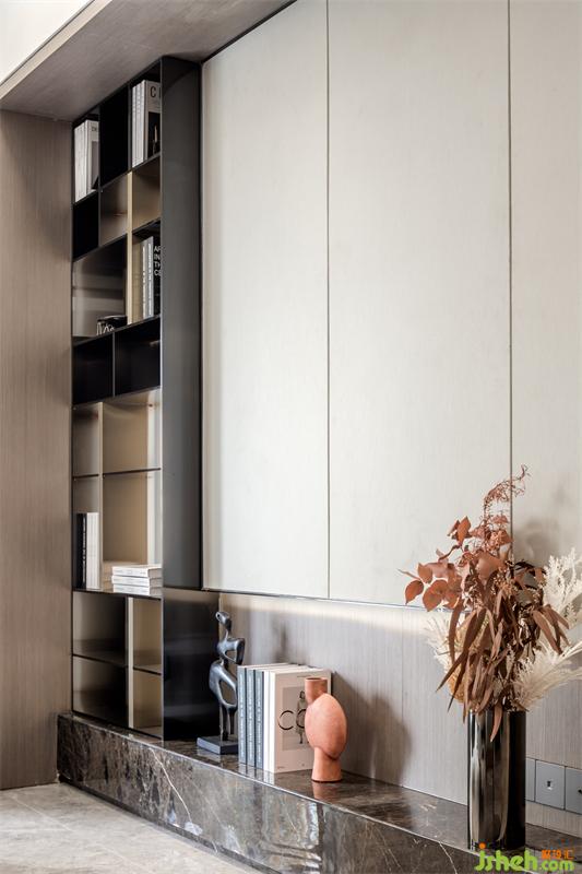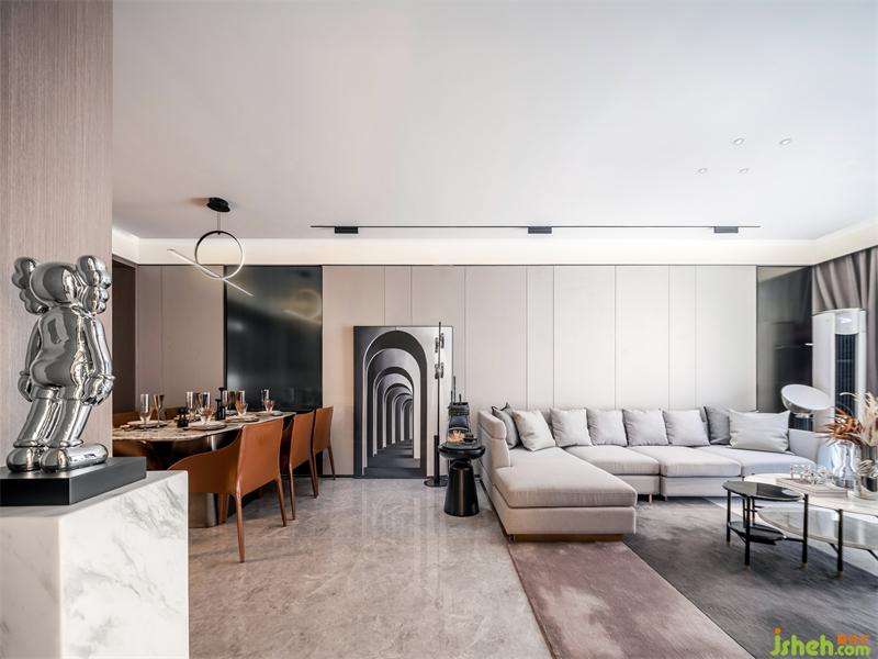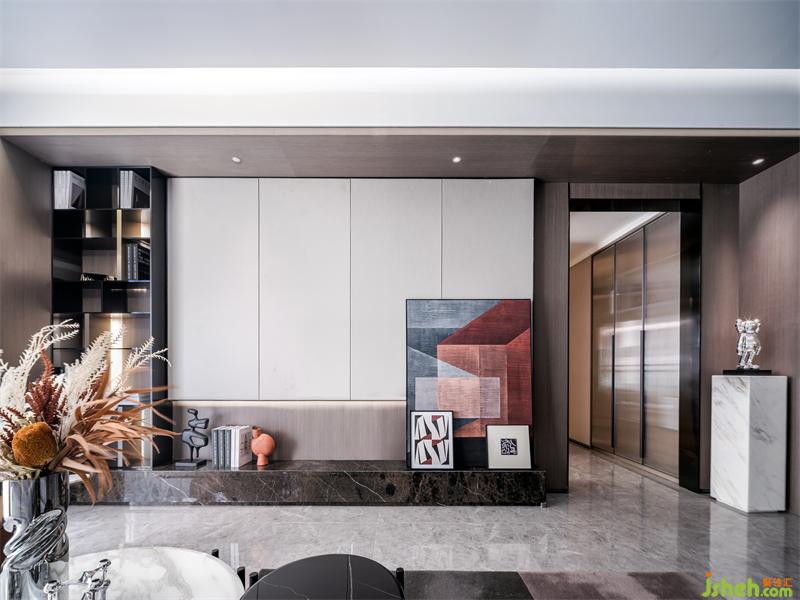 在設(shè)定中,男主人是某企業(yè)高管,女主人是雜志編輯,藝術(shù)是居者在空間中呼吸、生活、沉浸與作畫的基底。因此,朗昇設(shè)計以簡約的筆法、個性化的語素,為這個面積107㎡的居所描繪了有著濃郁藝術(shù)氣息的生活圖景。