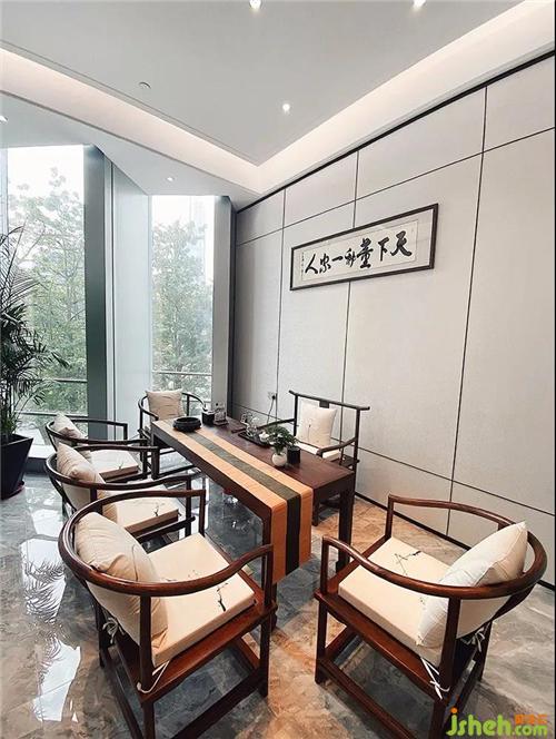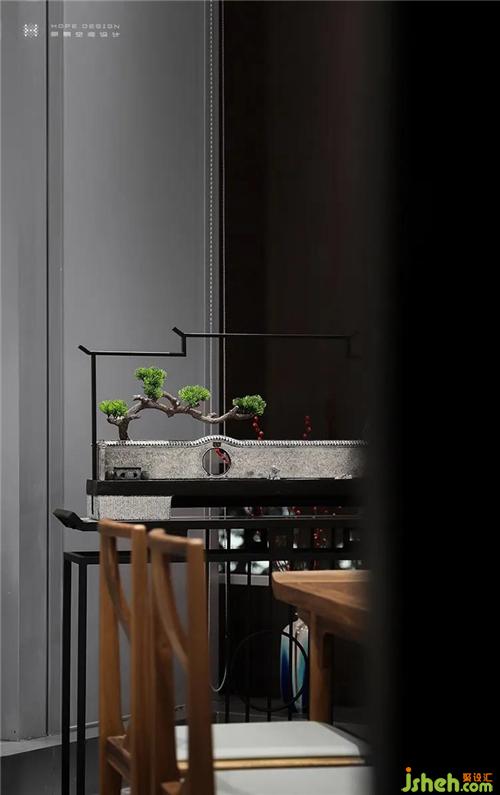 設(shè)計師考量視覺美學(xué),為將墻面題字融入氛圍,選用水墨花紋的坐墊靠枕進(jìn)行點(diǎn)綴,讓空間更有清逸雅韻。玉碗光含仙掌露,金芽香帶玉溪云。邀三五好友,聚于雅室,思大業(yè)品茶香,生活本該如此。