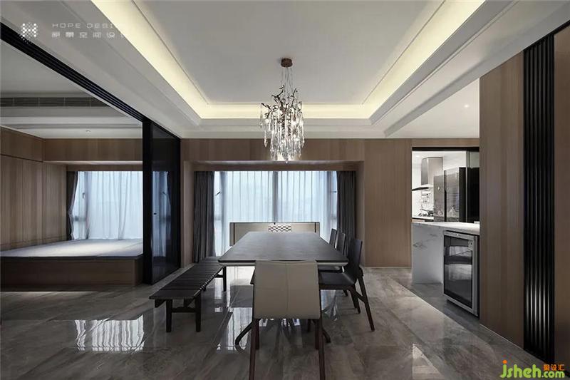 從客餐廳中可以看到設(shè)計(jì)師對光線、材料選擇、空間構(gòu)成的思考,不僅考慮到自然光線的引入,也考慮到不同類型的燈光設(shè)計(jì)組合去塑造空間,為空間帶來充足光源的同時(shí),也提供了美觀造型。配合上不同的材料,光更加是產(chǎn)生出不同的視覺質(zhì)感,更能把想傳遞的情感都放到了空間里。