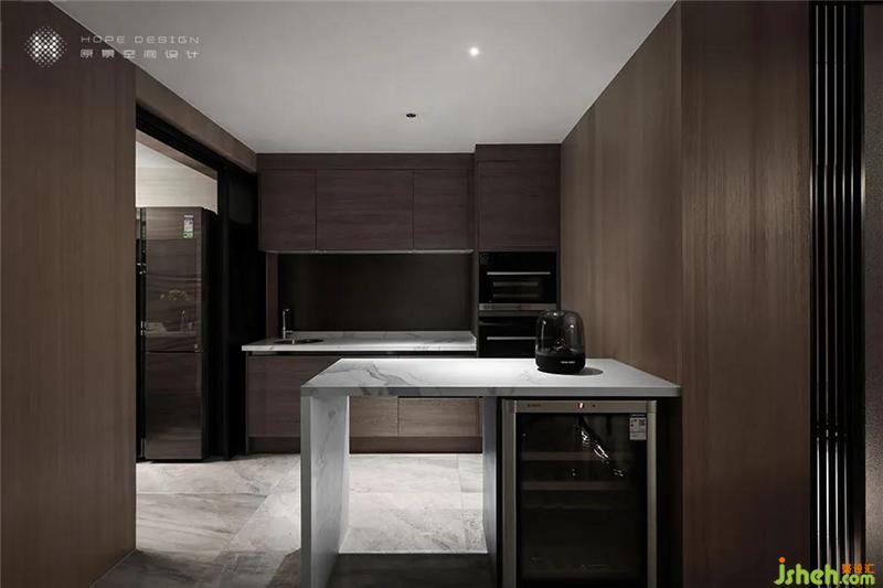 玄關(guān)右側(cè)是廚房區(qū)域,我們在優(yōu)化餐廚動(dòng)線的基礎(chǔ)上通過合理切割資源,打造了獨(dú)立的中西廚區(qū)域房。從西廚“借”了一部分空間給玄關(guān),為玄關(guān)增加鞋柜與儲(chǔ)物柜。深圳裝修設(shè)計(jì)西廚增設(shè)巖板吧臺,在不同光線的作用下,自然細(xì)密的肌理顯露出不同層次的色彩,方寸間勾勒出碎碎念與小歡喜,層層鋪開溫馨的生活碎片。