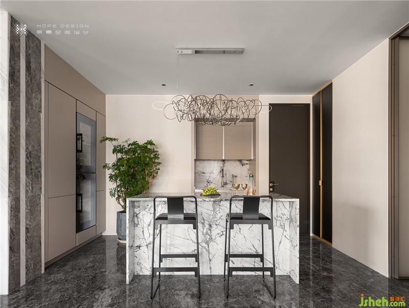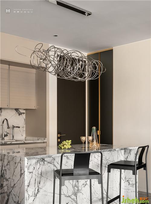 進門以天然大理石中島規(guī)劃"回"形動線,其自然多變的紋理給予空間強烈的張力。定制不規(guī)則排列的燈具,讓藝術(shù)氛圍擴散的同時,更與中島呼應(yīng)映射出不羈的生活態(tài)度。